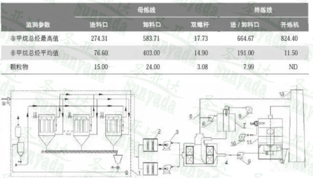 解决方案: 废气相关指标调研对废气的风量和浓度的调研。为详细了解炼胶车间的污染物排放情况,我们选择了国内某轮胎厂炼胶车间作为研究对象(该轮胎厂具备完整的废气收集和排放管道),收集风量为40万m3/h。 通过FID连续监测设备监测胶料废气在母炼生产过程中的排放情况,监测数据见表1。 根据表1监测数据,有以下结论:胶料生产过程中各排口非甲烷总烃排放浓度差距较大,其中母炼进料口、母炼卸料口及终炼进/卸料口3个排口浓度较高,双螺杆、开炼机浓度较低。