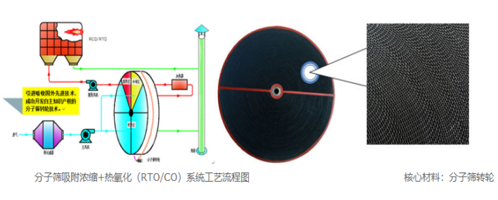 分子筛转轮吸附浓缩+热氧化技术(RCO/RTO)适用于低浓度、大风量的挥发性有机废气净化处理。