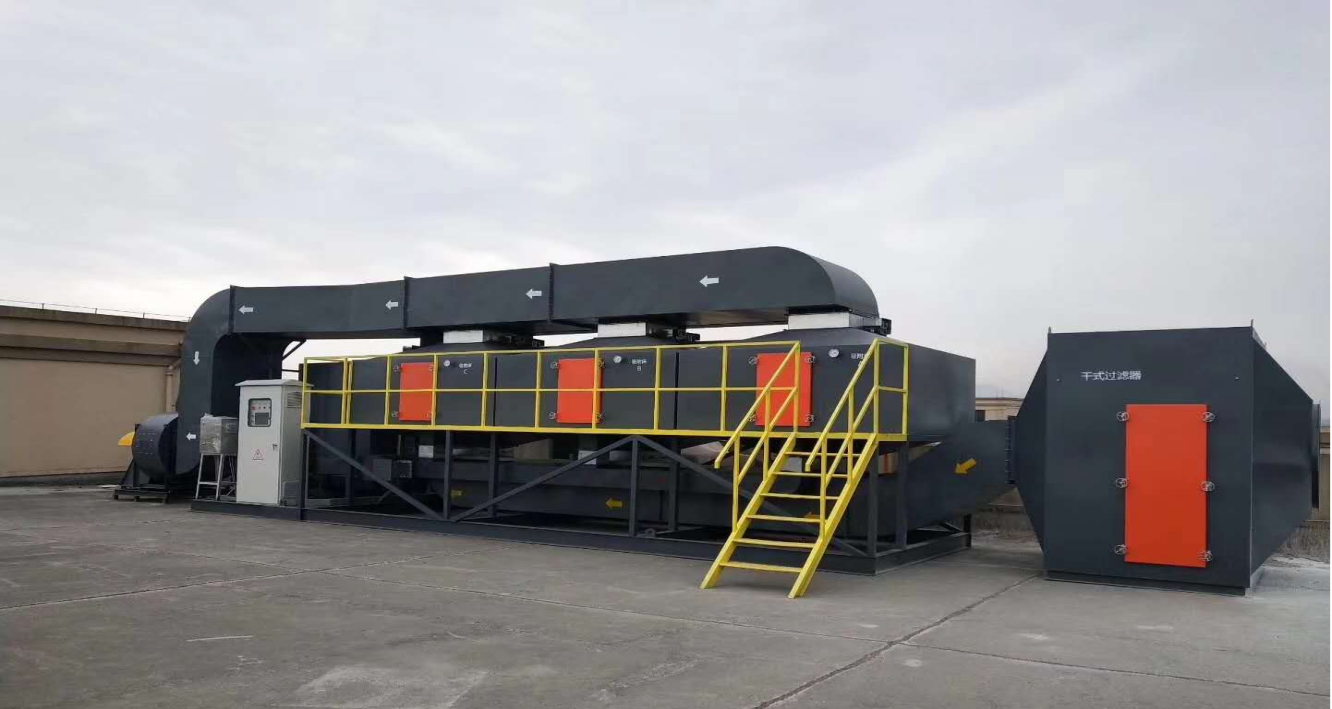 废气的吸附浓缩主要利用的是活性炭的吸附作用。本套设备由几套活性炭吸附箱组成,本系统运行时先打开活性炭吸附箱,将工业废气进行吸附浓缩,活性炭吸附饱和后,再打开第2套活性炭吸附箱进行与活性炭吸附箱类似的吸附过程,在第2套活性炭吸附箱工作的同时,活性炭吸附箱发生解吸。依此类推,此套系统里的活性炭吸附箱循环的进行着吸附和解吸的过程,解吸后的工业废气进入催化燃烧设备,废气被氧化分解成无毒无害的小分子化合物,达标排放。