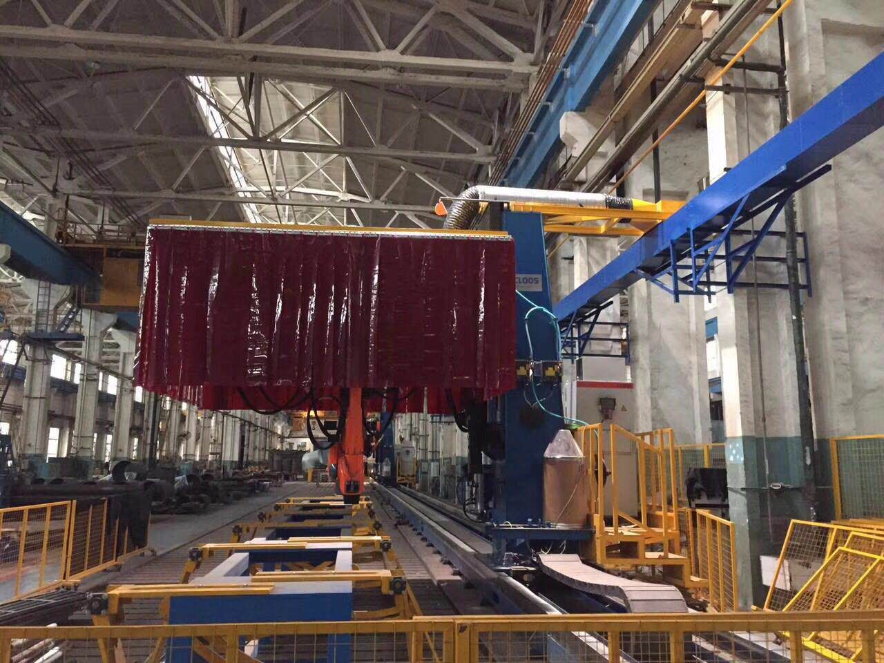 第二种,就是在焊接机器人上方设置顶吸罩可移动式顶吸罩。顶吸罩在焊接机器人焊烟收集的应用中较为普遍的,像我们之前为广东某客户定制的机器人焊接除尘方案,就是采用这种方式。我们结合客户工况及机器人路径设计顶吸罩的尺寸大小,为其设计研发了此款机器人焊接除尘设备。该款设备采用四周悬挂防护软帘设计,能有效防止焊接飞溅,其可悬吊在天花板上或安装在可移动的机器人龙门架上,能为工厂设计提供了大量空间。