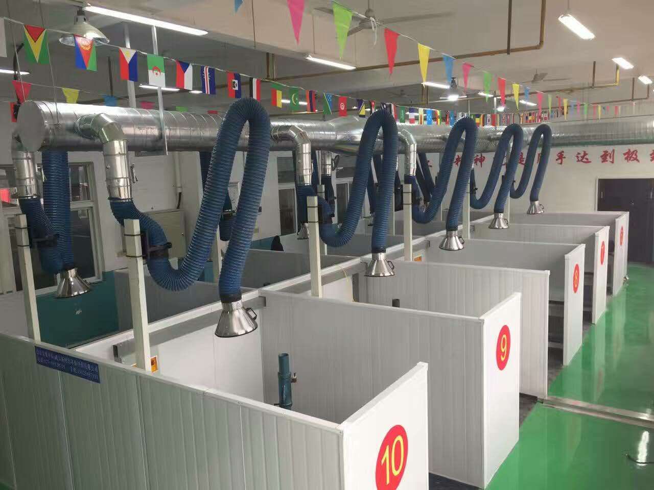 焊烟滤筒除尘器系统是由除尘器,风机,管道,吸气臂(吸尘罩),排放烟囱等组成。车间焊烟净化的主管道要和除尘器、风机的型号参数匹配,材质可以采用碳钢管和镀锌管两种,在车间上方或者车间墙上布置主管道,然后再分支到每个工位,焊接小工件的用吸气臂就可以,吸气臂可以任意方向活动,非常方便,如果焊接大工件,则需要安装一个吸尘罩,这样可以有效的把焊烟通过吸尘罩,管道,引到除尘器进行过滤净化。