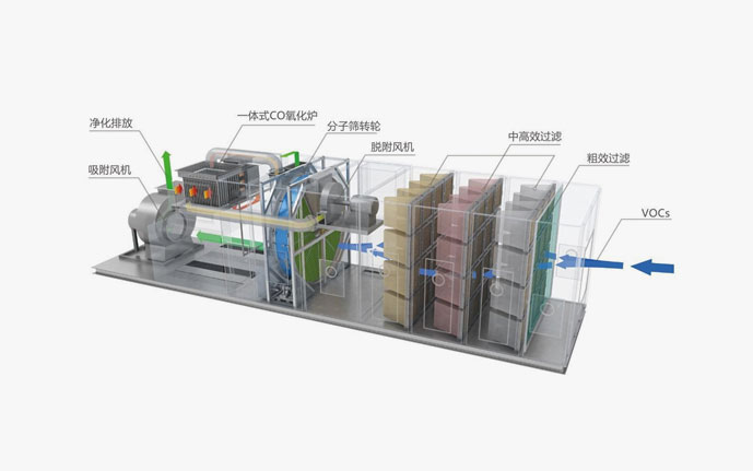 烟气通过转轮内的沸石被吸附,以系统抽气变频风机将干净尾气排入大气; 吸附器可提供大量的气体接触沸石表面积,转轮持续以每小1~6转的速度旋转。
