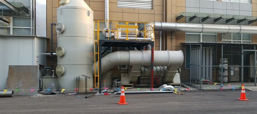 此种工艺适用于喷漆,化工等行业,针对含尘及其他酸碱废气先用喷淋塔进行吸收,然后进行除雾净化,经过喷淋塔净化后的废气在经过活性炭吸附装置完成净化。