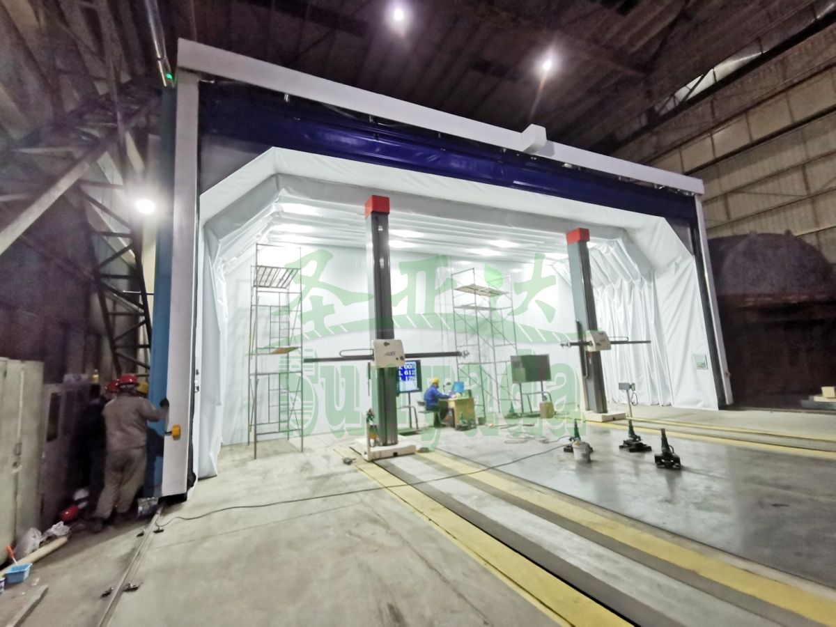 伸缩房是为解决重型工件移动难及工作区的综合利用而设计的实用性环保设备,由多组可保持平行移动的框架及连接框架的段接篷布组成,框架之间的滑动连接机构可在框架驱动装置的带动下沿地面的轨道前后移动时保持竖直平行,同时带动篷布展开合拢,一般固定式除尘房遇到重型工件移入移出的工序无法用行车、台车搬运,而移动除尘房可克服此弊端。工件打磨前首先通过电控柜控制移动伸缩房收缩合拢,待工件用行车安放就位后可控制移动除尘房伸开至“罩”住工件,即可实施打磨作业,使用很广泛。